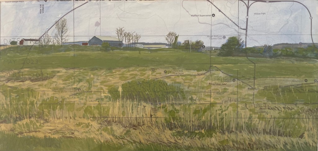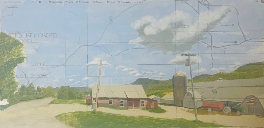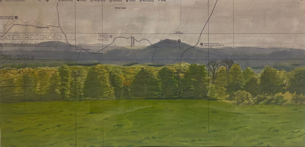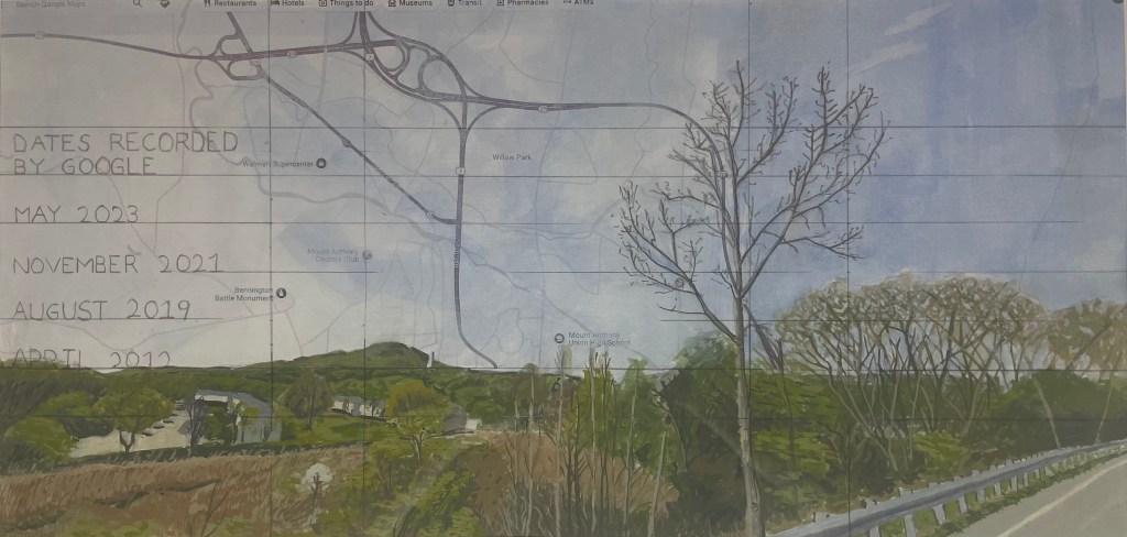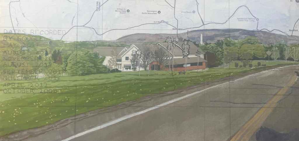 View of the Monument #1 (486 Orchard Road, Bennington, VT), 9″ x 18″, Gouache and Graphite on Inkjet Print on Paper.