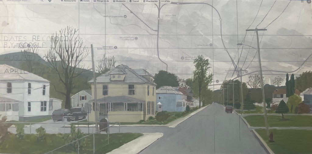 View of the Monument #2 (112 Hillside Street, Bennington, VT), 9″ x 18″, Gouache and Graphite on Inkjet Print on Paper