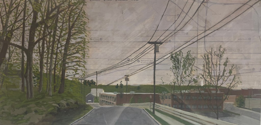 View of the Monument #4 (999 County Street, Bennington, VT), 9″ x 18″, Gouache and Graphite on Inkjet Print on Paper