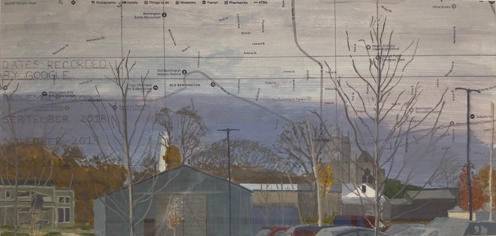 The series “A Greater Awareness of Awareness” explores themes of surveillance and its growing presence in our daily lives. Using the visual language of spreadsheets, local maps, and Google Street View information, the series reminds the viewer how accessible surveillance, information-gathering, and information-curating technologies have become to the average person. While Google Street View has visited each area multiple times, only one time was chosen for each piece, prompting the viewer to ask why this image was chosen and what purpose it serves. In each piece, the Bennington Monument has been replaced by the Washington Monument, a reminder of the current administration’s aims to collect as much data as possible, curate it, and use it for their benefit.