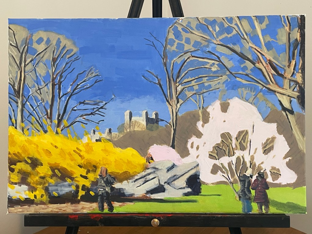 Cherry Blossoms with Belvedere Castle, Oil on Canvas, 30.5x46cm (12″x18″), 2024.