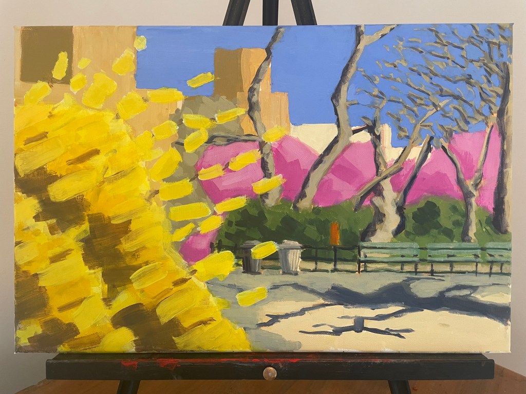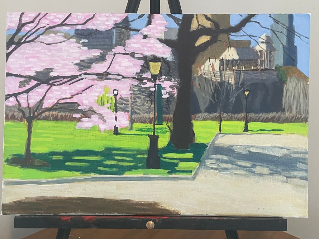Magnolias and The Met, Oil on Canvas, 12″x18″, 2024.