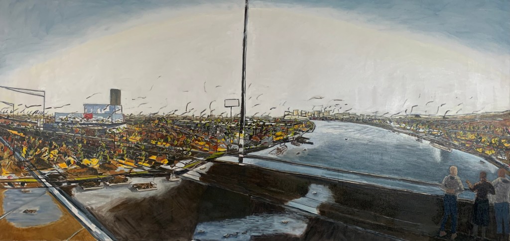 Bridge Highway (View of the City of Newark from the Jersey Turnpike), 2021, Oil on Canvas, 114.3×233.7cm (45″x92″)